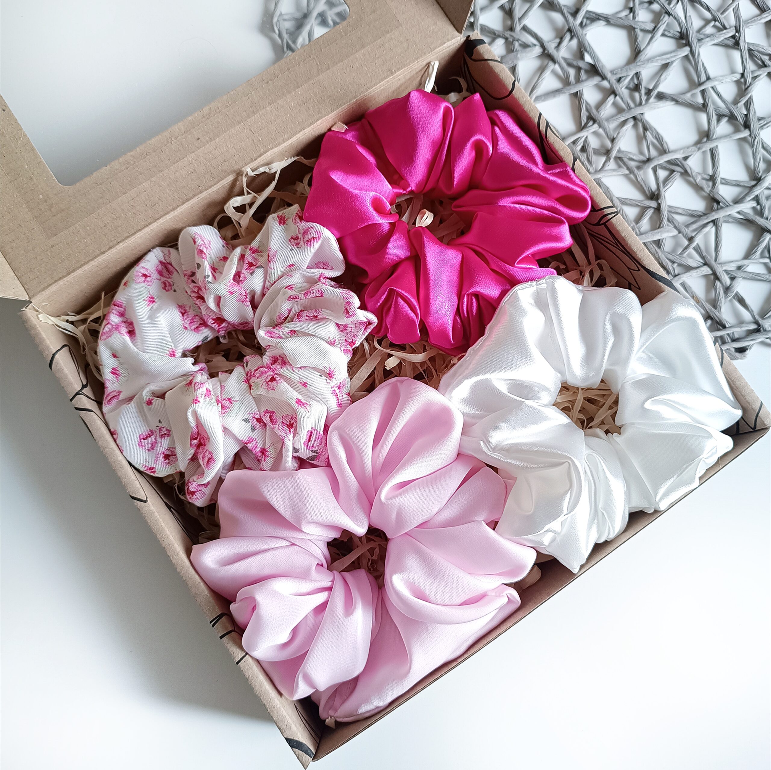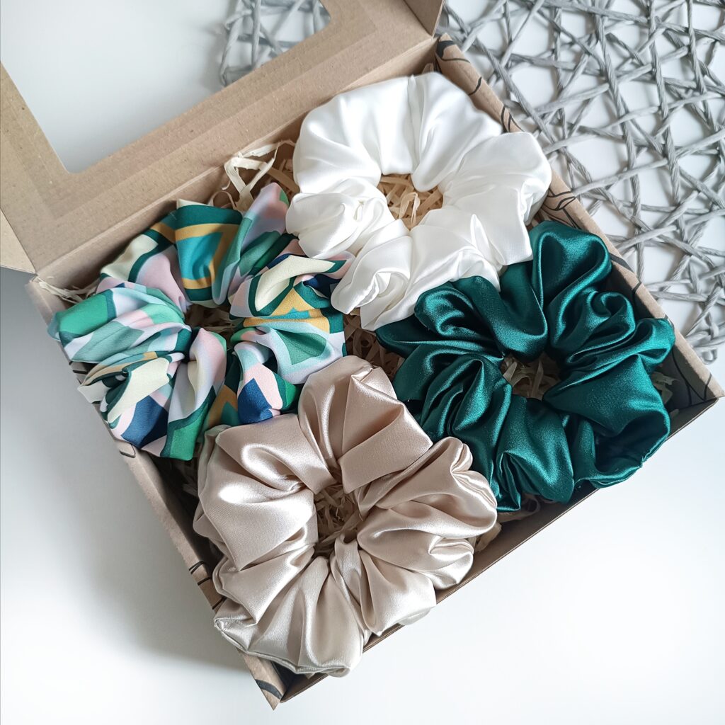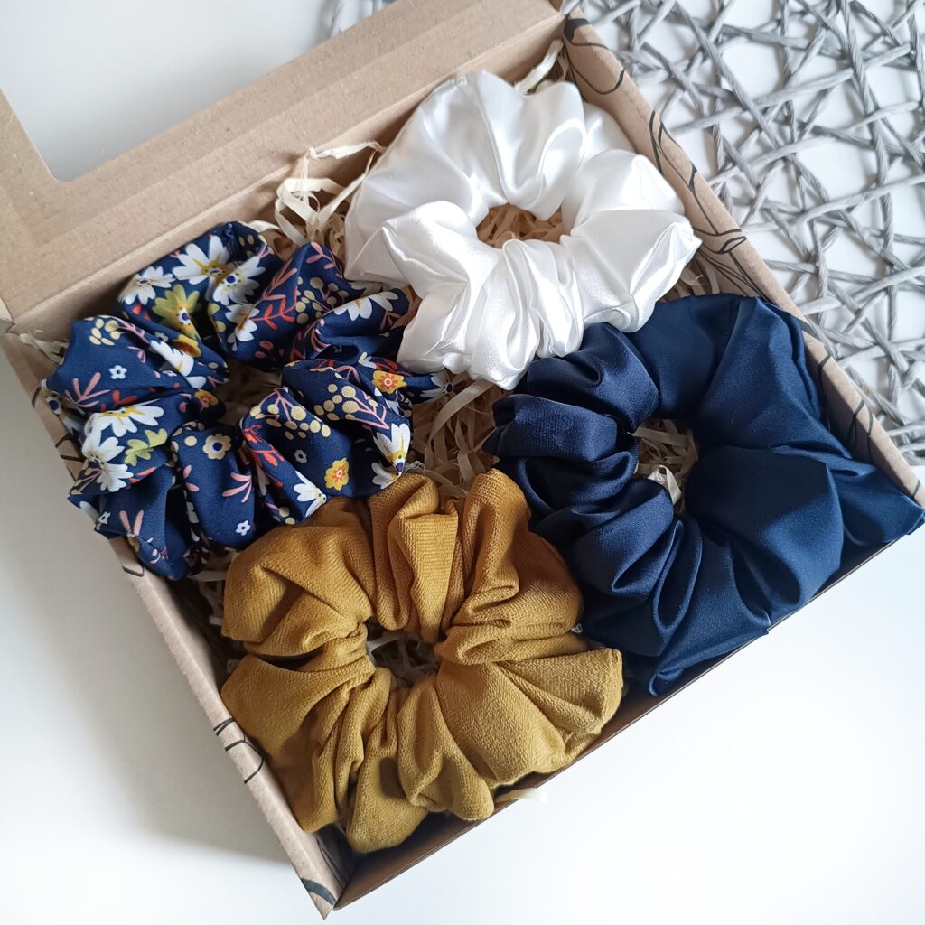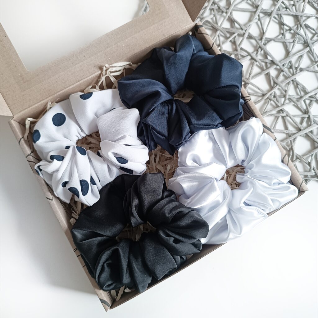 Eleganckie zestawy prezentowe zawierają 4 ręcznie szyte scrunchies, wykonane z najwyższej jakości materiałów. Każda gumka została starannie uszyta, aby zapewnić trwałość, wygodę i delikatność dla włosów. Scrunchies są kolorystycznie dopasowane, tworząc harmonijny zestaw, który doskonale sprawdzi się jako stylowy dodatek na co dzień i na specjalne okazje.