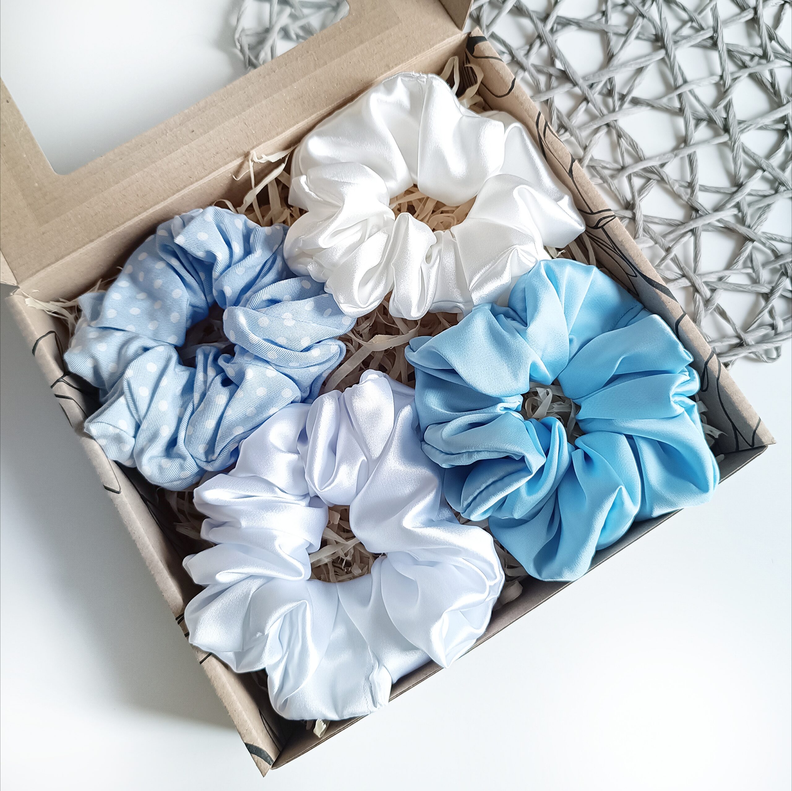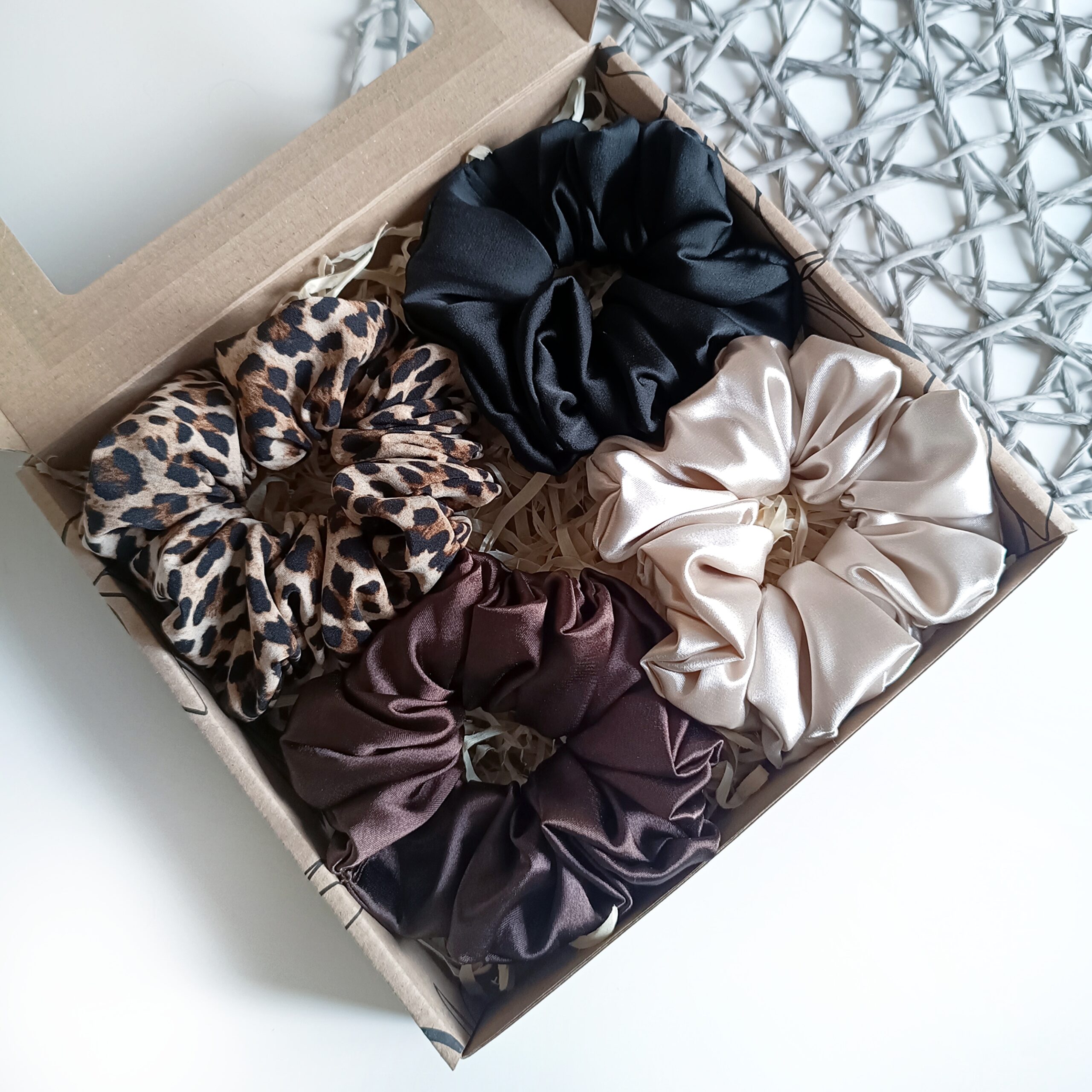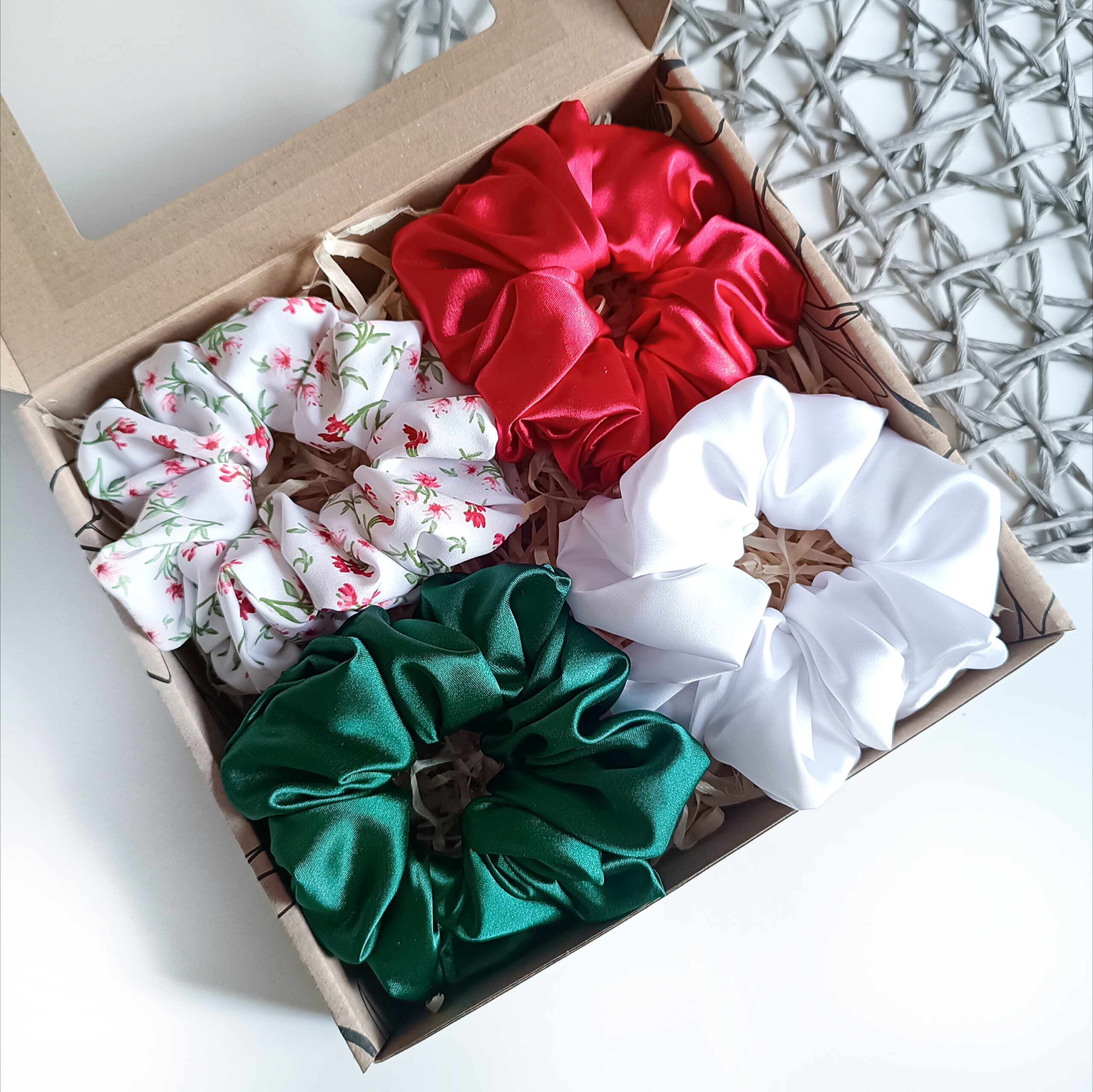 Eleganckie zestawy prezentowe zawierają 4 ręcznie szyte scrunchies, wykonane z najwyższej jakości materiałów. Każda gumka została starannie uszyta, aby zapewnić trwałość, wygodę i delikatność dla włosów. Scrunchies są kolorystycznie dopasowane, tworząc harmonijny zestaw, który doskonale sprawdzi się jako stylowy dodatek na co dzień i na specjalne okazje.